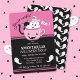 Um convite para a festa do Dia das Bruxas, rosa e preto, bonito e amigável para crianças, apresentando um fantasma caprichoso em uma caneca de jack-o-lanterno e um gato negro e absurdo escondido atrás dela. O modelo fornecido facilita a personalização com suas próprias informações. O dorso é preto com um simples padrão de fantasma branco. © ArianeC Ilustrações — Todos os direitos reservados
