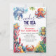 Faça um salto com este adorável convite de primeiro aniversario "Oneder the Sea"! Apresentando criaturas agudas do mar, ondas lúdicas e cores vibrantes do oceano, esta design é perfeita para o grande dia do seu pequenino. Personalize os detalhes para criar uma manutenção exclusiva para a sua celebração de temas subaquáticos. Divirta-se e torne o primeiro aniversário do seu filho inesquecível com este encantador convite!