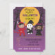 Um convite para crianças com crianças vestindo fantasias em um fundo roxo. Personalize-o com a data e hora e com a localização deste evento divertido. O fundo é um padrão de linhas roxas, laranja e vermelhas num fundo preto. © ArianeC Ilustrações — Todos os direitos reservados