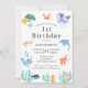Crianças bonitas primeiro aniversario convites de festas com um tema de animais marinhos incluindo peixes, golfinhos, camarões, tartarugas, baleias, cavalo-marinho, estrelas-do-mar e caranguejo.