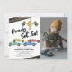 Rapazes convocatórias para o aniversário de carros de corrida com um simples fundo branco, uma foto da criança, 4 carros de corrida de cores, estradas, bandeiras com verificação, um troféu e um modelo de celebração de aniversário de criança que é fácil de personalizar.