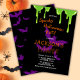 Você está procurando por um convite de aniversário de Halloween assustador e divertido que dará arrepios aos seus convidados? Não olhe mais que este convite com lodo verde e morcegos roxos em um pano de fundo preto. Use as ferramentas de design para personalizar o texto, a fonte e as cores. Também disponível como download digital.