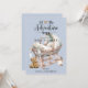 Um convite para chá de fraldas ruidoso com estilo 'boho' com um berço de bambu em fundo azul.