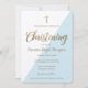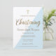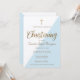 O Natal do seu filho é um dia especial. Este evento é algo que deve ser apreciado e celebrado. Com o Covid-19, crise do vírus Corona, distanciamento social pode impedi-lo de convidar hóspedes para o seu evento, mas fazê-los testemunhar, e fazer parte dele ainda é possível. Este convite para batismo virtual permite personalizar facilmente com seus próprios detalhes. Personalize este convite para o dia especial do seu filho com horário de transmissão, data, links, senhas e informações sobre a recepção. Design de Convite Moderno usando impressão de ouro falso e tipografia com sotaque azul triangular. Fontes de script elegantes, uma cruz impressão dourada