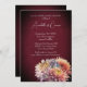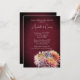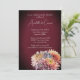 Este convite para o casamento floral de outono apresenta um design romântico e sangrento com lindas flores de outono. O fundo é uma cor vermelha-escura com uma sombra ao redor da borda. Um buquê de crisântemos é ilustrado no canto inferior direito.