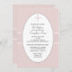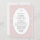 Um plano de fundo esbranquiçado, manchado com pequenos pontos brancos, apresenta um centro oval branco com uma cruz de pincel que mantém sua redação personalizada. O convite é cruzado por uma fita de textura larga, aparada em branco. Este é um convite encantador para qualquer ocasião religiosa.