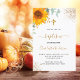 Um fundo branco decorado com girassol de cor aquosa, verde de eucalipto e folhas de ouro e gotas falsas de ouro. Personalize e o nome e os detalhes da cerimônia. Letras pretas e ouros coloridas. Sexo neutro. Traseira: fundo branco com quedas de brilho de falso ouro
