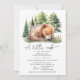 Convites de natação para bebês, bonitos e com tema florestal, com uma ilustração aquática de um filhote de urso sonolento numa floresta verde cênica. A design neutra do gênero é ideal para um bebê ou uma menina. O texto padrão diz: "Um pequeno filhote está a caminho!". O verso é um verde-oliva mudo.