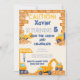 CUIDADO! Convite de aniversário de Caminhões de Construção. Celebre seu dia especial com este convite de aniversário para caminhões! Um convite de aniversário divertido para uma festa de aniversário com tema de construção! Esse design de dois lados apresenta veículos de construção: um trator, um escavador, uma grua e um caminhão de cimento em esquema de cor amarelo, branco, preto, azul e cinza.