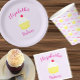 Cupcake baking birthday party for kids. Features a cupcake decorated with colorful sprinkles with a cherry on top