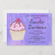 Um convite para festas de aniversário com uma ilustração de um cupcake com aspecto delicioso. Glacé rosa e garoa de chocolate. Um cupcake amarelo e uma framboesa no topo. Meu Deus! O fundo é uma textura de abstrato roxo com pequenos corações salpicados por todo o lado.
