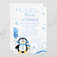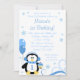 Um convite de aniversário bonito de inverno no interior. Com pinguim doce, cupcake, espiral e flocos de neve. Mostrado em tons de azul e branco. Personalize facilmente a sua festa!