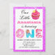 Garota e doce Cupcake roxo brilhante convite de primeiro aniversário com rosquinhas e doces. Adicione facilmente o nome do cheio e a data, hora e endereço da festa de aniversário. Perfeito para uma doce princesa virar uma!