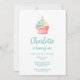 Um convite de aniversário de cupcake de aquarela fofo para seu primeiro aniversario. Você pode personalizar a caligrafia teal e as cores da fonte, assim como a cor de fundo branca minimalista. A cor da fonte de tons de turquesa é escolhida a partir do trabalho de arte de cupcake de de de cor d'água.