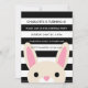Convite de festas de aniversário super bonito com listras brancas e pretas e um coelho curioso.