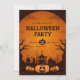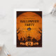 Halloween Party Invitation Card featuring a striking black silhouette of trees and a village against a glowing orange moon.