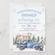 Sweet winter themed birthday invitation for a little boy featuring a blue truck, various woodland animals, pine-tree forest and cabin and some blue snowflakes. This woodland winter themed birthday invitation could be used for any age.