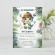 Celebrate your little explorer with this adorable dinosaur-themed baby shower invitation! Featuring a charming baby dino dressed as a detective, surrounded by lush jungle leaves and paw prints, this design is perfect for a fun and playful baby boy shower. Personalize all the event details easily and make your special day even more memorable. Ideal for jungle, safari, or adventure-themed celebrations!