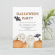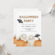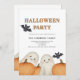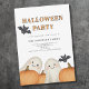 Cute ghost pumpkin Halloween party invitation. Easy to change the text. Fun Halloween design. The text Halloween party is in orange and black. The ghosts, pumpkins and bat are on the front and back. Cute design for a kid's party.