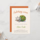 Adorable hatching soon baby shower invitation with an illustration of a baby dinosaur or baby dragon about to hatch. Great for gender neutral baby showers since the colors are neutral green, orange and grey. Illustrated and designed by Patricia Alvarez.