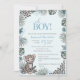 This Cute Leopard Safari Boy Baby Shower Invitation features a hand-drawn baby boy leopard in the corner, framed by a jungle-inspired leaf border with blue hibiscus flowers for a playful tropical touch. The title “Oh Boy!” adds a sweet focal point, while all other text is fully editable for easy personalization.