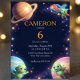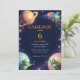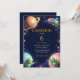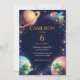 This custom birthday party invitation features a playful outers pace theme. Three cute green aliens are pictured near planets, glowing stars, and a little rocket ship. The colorful and charming illustration on this invite is perfect for a child's birthday.
