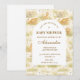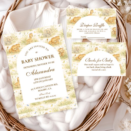 A sweet storybook-style safari design featuring gentle watercolor baby animals including lions, giraffes, and elephants surrounded by soft jungle greenery and a delicate botanical background. The warm neutral palette of cream, honey gold, and soft olive creates a timeless nature-inspired aesthetic, while the elegant arched layout provides a beautiful space for event details.