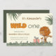 Um convite de aniversário selvagem com uma ilustração de um leão bonito com um presente. Ilustrada e projetada por Patricia Alvarez.