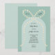 My daisy bow baby shower invitation features an arch background in two shades of teal with a large bow adorned with hand drawn daisies.