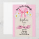 This adorable pink floral and bow invitation features white daisies with golden yellow centers and soft watercolor-style pink bows with a pastel pink background. This charming feminine aesthetic is perfect for a girly party. The daisy and bows create a playful cottagecore vibe that is both trendy and timeless. The sweetest modern invitation for a birthday girl.