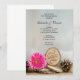 Mantenha a festa animada na manhã após a cerimônia de casamento com o convite de café da manhã pós-casamento campestre Rosa Rústico natural. Este convite personalizado casual, mas sofisticado, com inspiração ao ar livre em bosques ou florestas, para um café da manhã ou almoço pós-casamento, apresenta uma fotografia da natureza com um buquê de flor de gerbera rosa, duas pinhas marrons, véu de noiva branco e fatias de madeira com a palavra AMOR queimada, tudo sobre um fundo de juta e cetim branco.