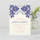 Elegante damask motif marinho azul, rosa, convite para janto de ensaio de casamento de marfim. Um design de casamento moderno, mas clássico, com um talento retrô. Um delicado design de casamento com vintage sente-o, perfeito para um casamento de primavera ou verão contemporâneo ou tradicional.