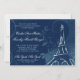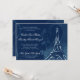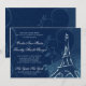 Rodovalho, lembrando um coração, creme e rebento sobre uma impressionante Torre Eiffel desenhada à mão contra o esbanjamento floral. Um poema de amor francês está escrito com afinco no fundo da safira escura, fornecendo o acompanhamento perfeito para o texto personalizável do convite de casamento em letras de estilos de escrita e gravura, também em branco espantoso. O texto padrão apresenta os pais da noiva e os pais do noivo, e a localização do casamento no roteiro.