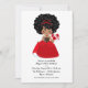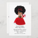 Convite de aniversário com uma princesa preta em um vestido de joaninha e uma tipografia de joaninha no verso.
