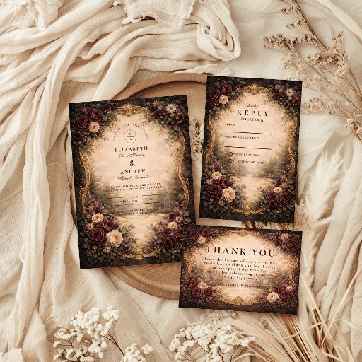 A richly detailed wedding design inspired by classic European Baroque art, featuring dramatic florals, ornate gold accents, and an aged parchment center. Deep burgundy and antique ivory tones create a timeless, romantic atmosphere with a touch of gothic elegance. Perfect for couples drawn to old-world luxury, fine art aesthetics, and statement stationery that feels both historic and refined.