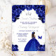 Este elegante e glamouroso e doce convite de 16 anos apresenta uma bela princesa com pele escura em um vestido azul escuro. O texto combina o script manuscrito e as fontes sans serif modernas para um aspecto elegante e sofisticado. Os arranjos florais, borboleta e confete prateado criam a mistura perfeita de rústico e chic. Gráficos por www.etsy.com/uk/shop/SunflowerDayLove