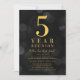 Convite de reunião de classe clássica com as palavras "5 Anos de Reunião" em folha de ouro falsa contra um fundo padrão de luzes de cinza escura. O convite tem uma cinza escura do lado de trás. Personalize este convite com seus detalhes substituindo o texto do marcador de posição. Para obter mais opções, como alterar a fonte, o tamanho/cor do texto ou o espaçamento entre letras, clique no botão "Personalizar". *Observe que a Marca d'água do Zazzle que aparece na visualização de zoom NÃO aparecerá no produto impresso final. © Rosewood e Citrus
