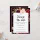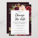 As coisas mudam. Mande este belo burgundy marsala floral mudar o cartão de data para mudar a data e, se necessário, o endereço e a hora do seu casamento ou evento. Este cartão vem em fundo burgundy escuro, preto, preto, branco e rosa. Veja as nossas coleções de "Mudar a Data" ou "Borgonha Marsala & Blush Floral" para ver as outras cores.