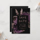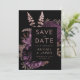 Este elegante e melancólico casamento Salve o cartão de Data apresenta um buquê floral romântico e luxuoso em roxo com folha de ouro rosa e folhagem brilhante num fundo negro. Personalize o texto rosa-rosa em fontes estilosas em um retângulo preto e adicione o URL do site de casamento ao preto sólido.