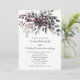 This wedding invitation showcases a rich, dark wine background that sets a tone of elegance and depth. At the top, a graceful floral arrangement unfurls in a mix of dusty purple blooms, soft lavender accents, and muted sage green leaves. The palette feels romantic and refined, with each shade contributing to a sense of quiet sophistication.
