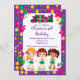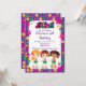 Comece a sua festa de aniversário de luau tropical com nosso lindo convite de aniversário de luau, com as meninas mais bonitas vestindo saias e chinelos de hula em um fundo de flores roxas coloridas e trendy. Bonito para uma festa de aniversario de meninas ou qualquer festa de verão ou piscina. Visite nosso compro para ver outros convites de festas de verão de luau e na moda modernos. © designs Babystar
