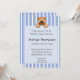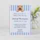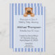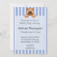 Personalize este Convite de aniversário colorido com os detalhes do seu partido. O fundo é listras azuis com um urso segurando um sinal com informações da festa.