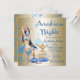Convites de festa de aniversário das Noites Árabes com belas ilustrações azuis e douradas em um fundo dourado. Este convite de festa e evento de aniversário das Noites Árabes é facilmente personalizado para o seu evento, basta adicionar seus detalhes. Este é um design impresso sem brilho real, folha, etc.