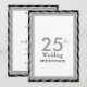 Aqui está um convite de festa de aniversário de casamento de 25 anos moderno para tornar o evento marcante especial e memorável. Uma borda prateada e preta com espirais brancas adiciona um visual moderno e elegante ao seu convite de aniversário de casamento de prata. O convite pode ser personalizado para qualquer aniversário - 10º, 25º, 30º, 50º, etc.
