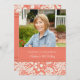 Convites de aniversário de 70 de fotografia personalizados em laranja de pêssego elegante, creme e padrão clássico de damasco floral branco. Adicione seu nome, foto e detalhes da festa para um convite de aniversário exclusivo e na moda.