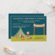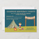 Este convite para festas de aniversário de meninos 5 horas por dia, 7 dias por semana tem um tema de acampamento. Ele apresenta um garoto cabeludo parado ao lado de uma fogueira com seu saco-cama aos seus pés. Ao fundo, há uma tenda verde com uma lanterna, um cachorro-quente sobre um pau, e um marshmallow sobre um pau na frente. À direita, há uma faixa com o nome do aniversariante que você pode personalizar facilmente. No topo e à esquerda, você pode personalizar todas as informações de festa de aniversário. © 2012 Jessica Weible/JW Ilustrações