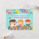 Se você está planejando uma festa no ginásio de brincar ou casa inflável, deixe as crianças convidadas animadas com o local da festa com este convite de aniversário! O design tem lindas crianças brincando alegremente na colorida piscina de bolas. Uma bandeira colorida combinando está pendurada acima das crianças. A página de trás tem grandes balões de festa! Os convidados vão ficar ansiosos por horas de diversão saltando e correndo pela casa inflável, a piscina de bolas e descendo os escorregadores! Personalize facilmente com os detalhes da festa!