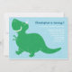 Este adorável convite de aniversário apresenta um feliz dinossauro verde T-Rex e um fundo azul. Perfeito para a festa de aniversário de um garoto.