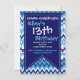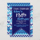Um convite de aniversário ou convite de evento de padrão divertido e ousado, com padrões azuis, lacrimejantes e turquesas chevron zigzag e geométricos. O verso tem o design de padrão de cor do cheio. Este convite é mostrado como um convite de aniversário de 13, mas esses modelos de convites de festas de aniversário fofos podem ser facilmente usados para crianças ou adultos, ou podem ser personalizados para qualquer tipo de festa ou evento. Basta preencher o texto com os detalhes do seu próprio partido. Se quiser alterar a cor do texto ou reorganizar as coisas, basta usar o botão "Personalizar". O verso do convite tem o mesmo padrão colorido que o lado frontal.