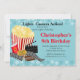 Comece sua Festa de aniversário Lights, Camera Action Movie com o convite de aniversário da noite de cinema giro com uma câmera de filme preta com pipoca, uma passagem de refrigerante e filme sobre um fundo azul claro com estrelas A parte de trás do convite apresenta uma cor preta coordenadora. Totalmente personalizável para você com suas informações. ©Babystar Designs